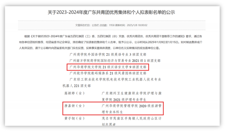 近日 , 共青团广东省委员会发布了2023—2024年度广东省五四红旗团 ( 工) 委 、 五四红旗团(总) 支部 、 优秀共青团员和优秀共青团干部名单,我校文学院21级汉语言文学9班团支部荣获“广东省五四红旗团支部”,管理学院优秀校友唐嘉妍荣获“广东省优秀共青团员”。