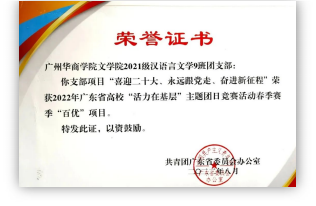 文学院21级汉语言文学团支部建立于2021年9月 , 共有团员45人 , 团支部书记1人 。 支部项目“喜迎二十大 ,永远跟党走 ,奋进新征程”曾获2022年广东省高校“活力在基层”主题团日竞赛活动春季赛季“百优”“千入围”项目 。曾获广州华商学院委员会2022年度共青团工作优秀团支部 、2022年广州华商学院文学院11月“学习二十大 ,永远跟党走,奋进新征程”团生活动第⼀名、2022 — 2023学年广州华商学院文学院4月团组织活动二等奖。