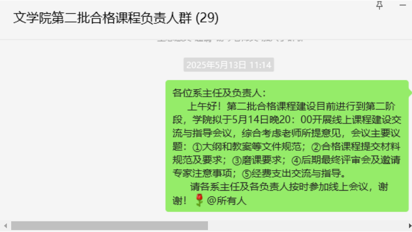 为深入贯彻落实新时代全国高等学校本科教育工作会议精神,进一步推进课程质量提升工程,文学院于5月14日(周三),以线上会议形式,组织召开了第二批课程提升交流与指导会。会议围绕课程材料规范、磨课要求、合格课程评审及经费管理等内容展开深入研讨,旨在通过规范化、精细化的教学管理,全面提升课程建设水平。各系部负责人、课程组教师及相关管理人员参会。