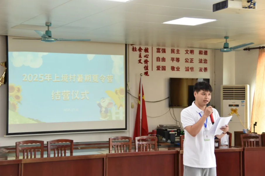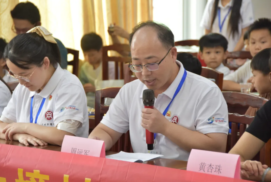 接下来是广州华商学院文学院代表周远军老师发言。首先,周远军老师对仙村镇村委、社工服务站和上境村淳朴的乡亲们的支持表示衷心感谢,强调正是他们的无私帮助和大力支持,才保障了本次暑期社会实践活动的顺利与精彩的完成;其次,他在回顾了队员们在上境村的实践经历时,表示队员们不仅是实践者,更是乡村的深度体验者,他高度肯定了队员们的付出,指出大家努力将党的关怀与青春热情融入每一堂生动课程,通过持续的陪伴与交流,致力于为乡村带来新的气息;最后周远军老师寄语参加夏令营的孩子们,希望他们将这十余天的所学所感转化为未来成长的动力,勇敢追逐自己的梦想。