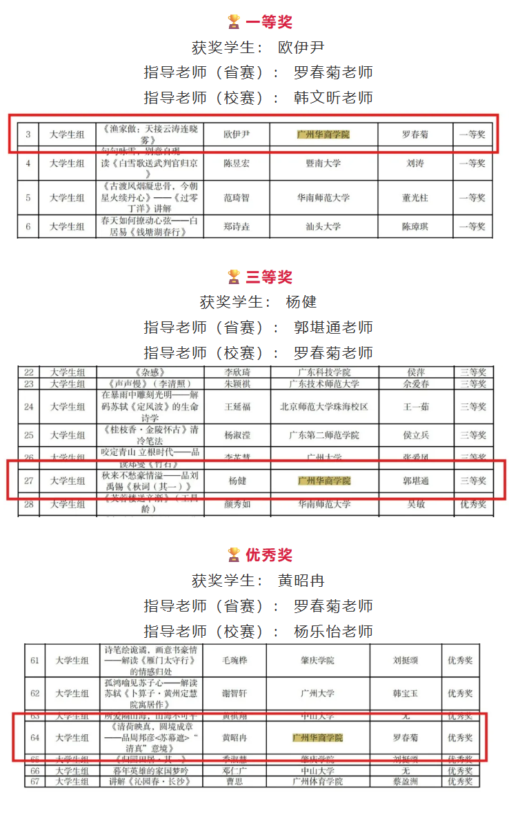 此次在2025年广东省“诗教中国”诗词讲解大赛中取得的优异成绩,是我院学子人文素养和综合能力的有力彰显,也极大地鼓舞了全院师生传承与弘扬中华优秀传统文化的信心与热情。我们再次向所有获奖同学和辛勤付出的指导老师们致以最热烈的祝贺! 期待全院学子继续亲近经典,涵养诗心,不断提升文化自信与表达能力,在传承中华文脉、坚定文化自信的道路上书写更加绚丽的青春篇章! 学院将继续搭建平台、创造条件,支持更多学子在弘扬中华优秀传统文化的广阔舞台上展现才华、实现价值!