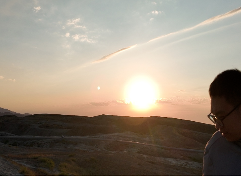 傍晚的风卷着戈壁的沙粒,众人踏着碎石登上泥火山观景台。当夕阳为火山口镀上熔金般的光泽,红褐色的泥浆在山口缓缓翻涌,与远处连绵的戈壁连成一片苍茫。落日的余晖漫过起伏的地势,将每一粒砂石都染成暖红,像岑参笔下 “平沙莽莽黄入天”的意境被轻轻铺展在眼前。 当落日沉潜时,泥浆微响与风过戈壁的轻吟交织,罗老师望着眼前的苍茫景象,忽然吟诵起“明月出天山,苍茫云海间”的诗句,她笑着和同学们分享道:“你们看这天地相接处的浑茫,与诗里天山明月升起时的壮阔何等相似啊!此刻虽无明月,可这落日熔金、戈壁绵延的气象,不正是‘苍茫’二字最生动的注脚?大自然从不会吝啬笔墨,无论是白日的雄浑还是月夜的辽远,都藏着让人心折的生机——这便是诗与大地的默契,无需多言,却早已刻进骨里。”夕阳渐沉入地平线,余晖将众人的身影拉得很长,罗老师吟诵的诗句余韵漫过火山口,与戈壁的晚风相融,成了此刻最动人的“边塞回响”。
