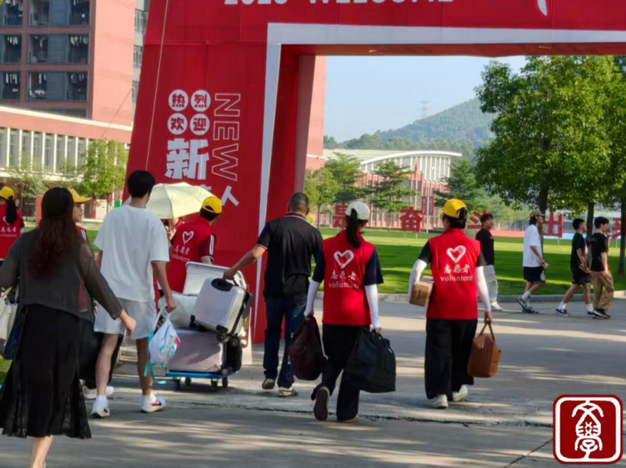 校门作为新生踏入校园的“第一站”,文学院志愿者们已在此等候。他们穿着醒目的红色志愿服,推着蓝色行李车,每当载着新生的车辆缓缓停下,志愿者们立刻上前熟练地接过行李箱、编织袋,稳妥安置在推车上,引导新生们前往宿舍区。从校门口到宿舍楼的这段路,志愿者们推着小车穿梭在校园小道上,汗水浸湿了后背,但脚步始终没有停歇。