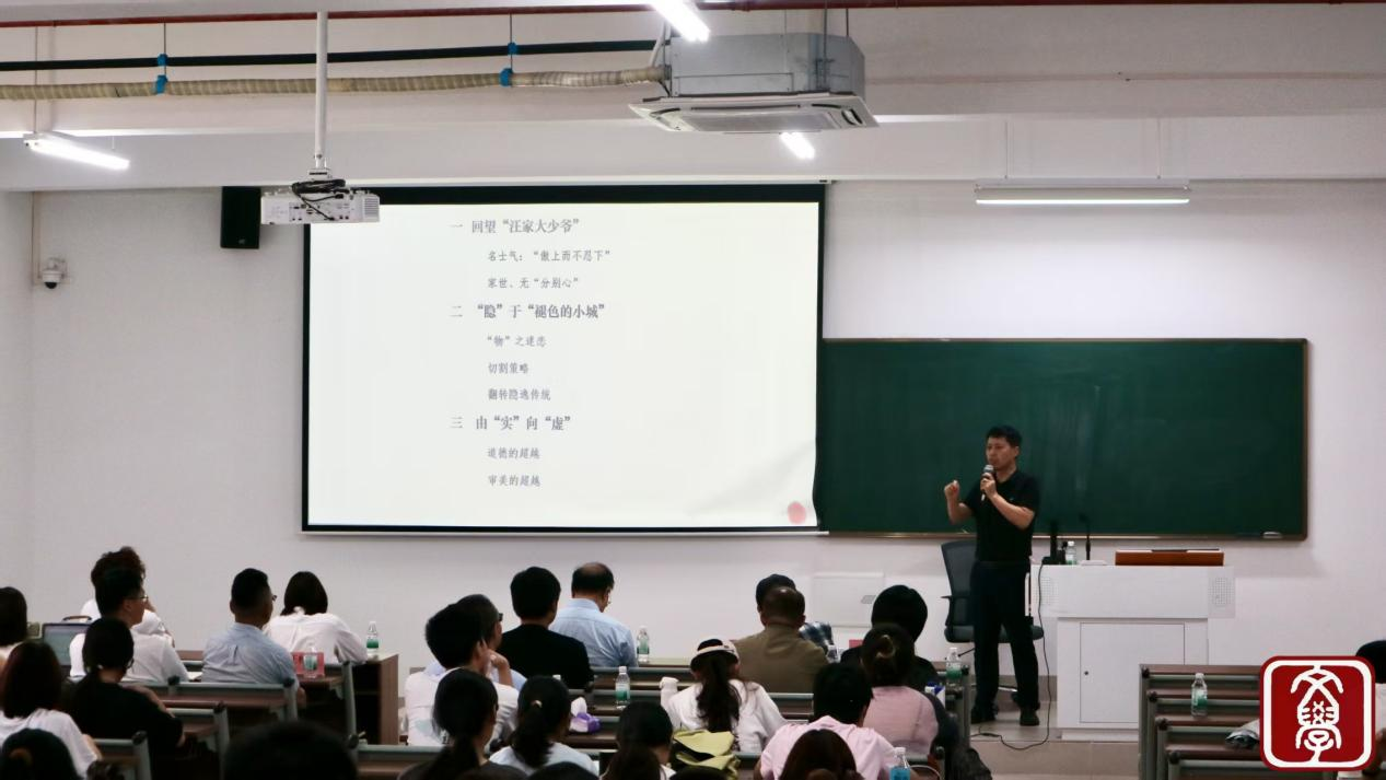 张均教授的发言在蒋教授的致辞后正式开始。张教授并没有单刀直入主题,而是谦逊地将本次讲座定义为交流学习,拉近师生之间的关系,并以《三国演义》与《红楼梦》为例,向我们说明文学有其现实依据的道理,这一理论正是张教授解读汪曾祺作品的切入点。随后,张教授展示了本次讲座的几个板块:一、回望“汪家大少爷”(包括名士气:“傲上而不忍下”以及家世、无分别心两个议题);二、“隐”于“褪色的小城”(包括“物”之迷恋、切割策略和翻转隐逸传统三个议题);三、由“实”向“虚”(包括道德的超越与审美的超越两个议题)。