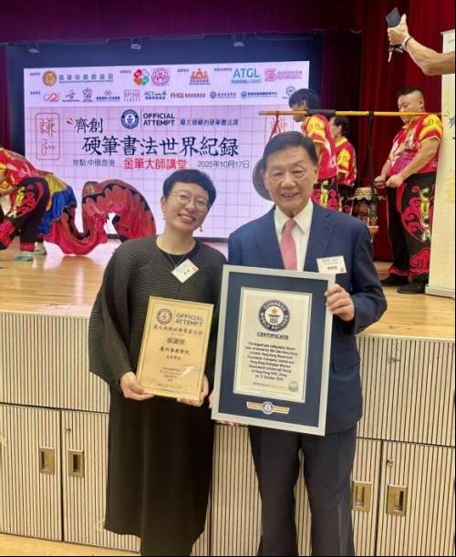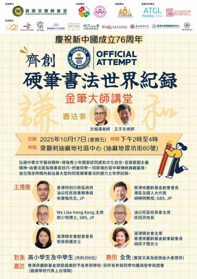 10月17日,香港宋庆龄基金联合多家教育机构,在港举办“齐创硬笔书法世界纪录”活动。近三百名中小学生与教师同堂挥笔,以硬笔书写《论语》《荀子》等中华经典语句。此活动最终以291名有效参与人数,成功打破健力士世界纪录。